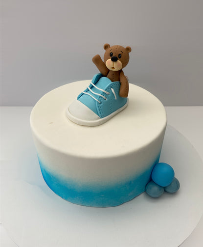 *Fondant cover cake with a touch of blue and a cute handmade and edible teddy topper.
