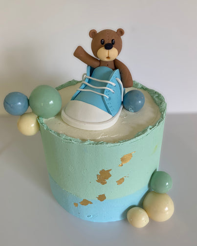 *Round cake covered in buttercream with chocolate bubbles and the most cute teddy topper. Perfect for baby showers or little ones birthday.