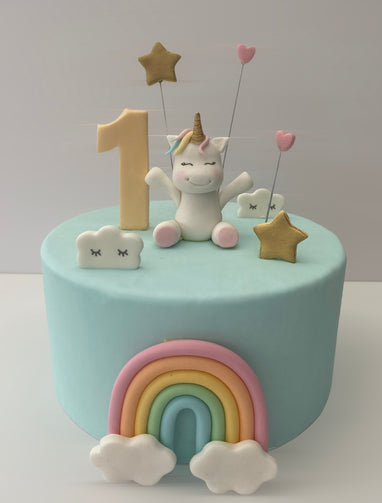*Fondant covered cake with a pastel rainbow, and handmade/edible Unicorn topper
